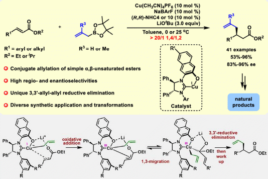 近日,中国科学院上海有机化学研究所殷亮课题组、薛小松课题组和孟繁柯课题组合作以一价铜—含酚羟基的手性NHC(Sawamura NHC)络合物为催化剂,首次实现了简单α,β-不饱和酯的催化不对称共轭烯丙基化反应,展现出优异的底物与官能团兼容性,且发现顺、反式底物反应产物立体化学一致的特殊现象,与传统亲核进攻机理相悖。通过机理对照实验结合DFT计算,提出了全新反应机制:烯丙基一价铜物种经氧化加成生成三价烯丙基铜物种,经1,3-烯丙基三价铜迁移后经历3,3′-还原消除生成目标产物并再生一价铜催化剂,合理解释了实验中的异常现象。这种区别于简单亲核加成的氧化还原新加成机制,是成功实现催化不对称共轭烯丙基化反应的核心关键。此外,作者通过该方法实现了三种具有生物活性的天然产物的形式不对称合成,展示了其合成实用性。